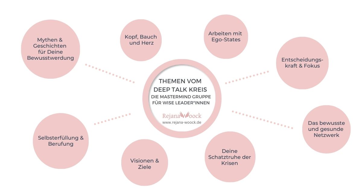 Ich helfe Dir! Zweimal im Jahr starte ich eine Deep Talk Gruppe, die in einem zweiwöchigen Rhythmus über einen Zeitraum von 12 Wochen tief und ehrlich miteinander kommuniziert. In meiner Mastermind-Gruppe für Wise Leader*innen wirst Du Teil eines achtsamen Kreises von Menschen, die sich intensiv mit ihrem Inneren beschäftigen, um ihrem Herzen zuzuhören. Bringe Dein aktuelles Lebensanliegen in einen inspirierenden Wandlungsprozess.