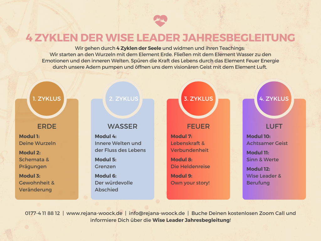 Möchtest Du Menschen inspirieren? Möchtest Du mit Deinen Fähigkeiten und inneren Werten der Welt Gutes tun? Bist Du müde und desillusioniert von Führungsstilen, wie sie heutzutage gelebt werden? Dann bist Du auf dem besten Weg zum Wise Leadership. Als weiser Leader strebst Du danach, zu einer reifen, geerdeten und integrierten Persönlichkeit zu werden. Du stabilisierst Dich durch Persönlichkeitsentwicklung, kompetente Hilfe und ein nährendes Netzwerk psychisch und körperlich, um lange und kraftvoll in dieser Welt wirken und inspirieren zu können.